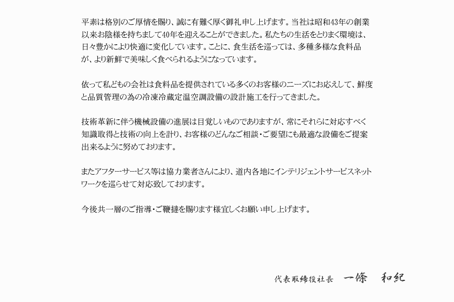 平素は格別のご厚情を賜り、誠に有難く厚く御礼申し上げます。当社は昭和43年の創業以来お陰様を持ちまして40年を迎えることができました。私たちの生活をとりまく環境は、日々豊かにより快適に変化しています。ことに、食生活を巡っては、多種多様な食料品が、より新鮮で美味しく食べられるようになっています。